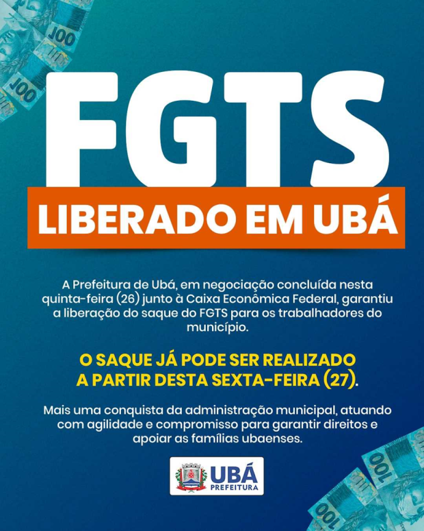 PREFEITURA DE UBÁ GARANTE LIBERAÇÃO DO FGTS E SAQUE JÁ PODE SER REALIZADO NESTA SEXTA-FEIRA (27)